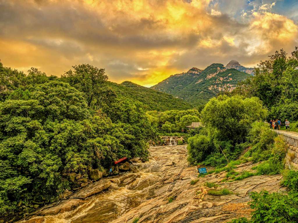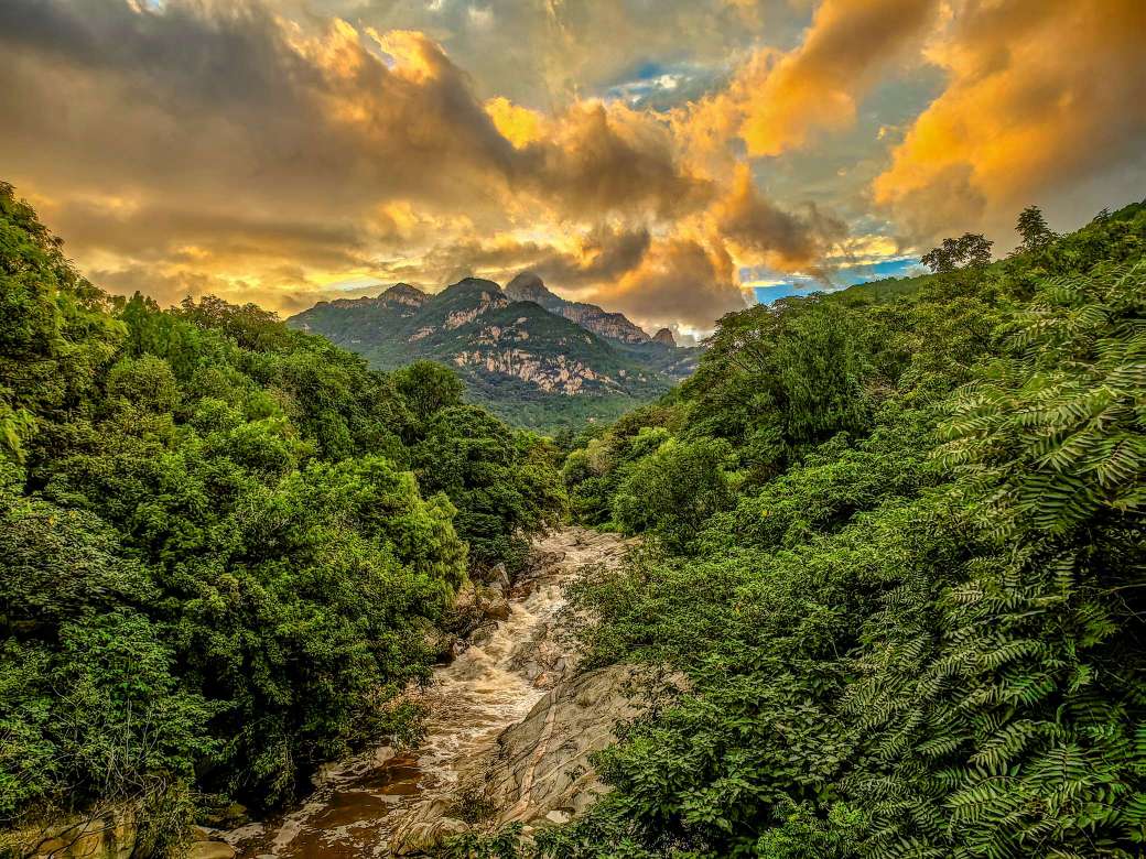 抬眼望去,天空像是被打翻了的颜料盘,彩云肆意铺展,红的热烈、橙的明艳、紫的神秘,与黛青色的山峦相互映衬,构成了一幅绝美的画卷。山间流水潺潺,在雨水的滋润下,溪流愈发欢腾,沿着嶙峋的山石奔腾而下。